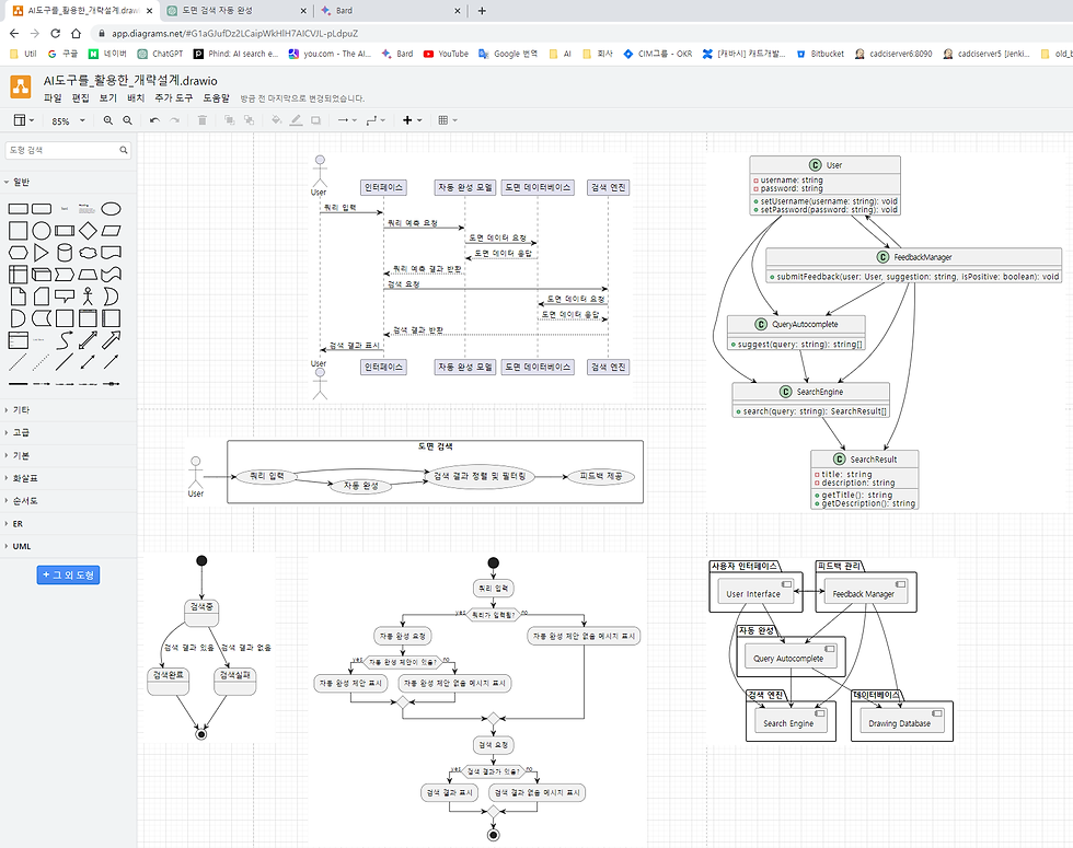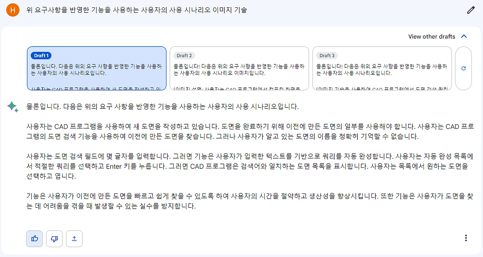 아래 기능에 대한 요구사항을 발산해봐: 도면 검색 쿼리 자동 완성 기능 사용자 경험 향상에 도움이 됩니다. 사용자가 도면을 검색할 때, AI가 쿼리를 자동 완성하여 빠르고 편리하게 원하는 도면을 찾을 수 있도록 합니다.