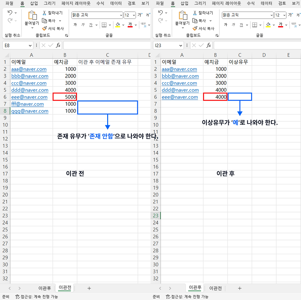 이를 테스트하기 위해 만든 엑셀 샘플을 제작했다. [① 이관전] 시트에서는 예치금을 가지고 있는 이메일(계정)이 ‘이관후’ 시트로 모두 올바르게 이관되었는지를 ‘이관 후 이메일 존재 유무’ 컬럼을 통해 확인할 것이고, [② 이관후] 시트에서는 해당 이메일(계정)의 예치금이 ‘이관전’ 시트와 동일하게 이관되었는지를 ‘이상유무’ 컬럼을 통해 확인할 것이다.